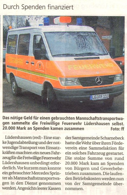 Am 17.November 2001 wurde ein MTW durch den Förderverein der Lüdershausener Feuerwehr übergeben